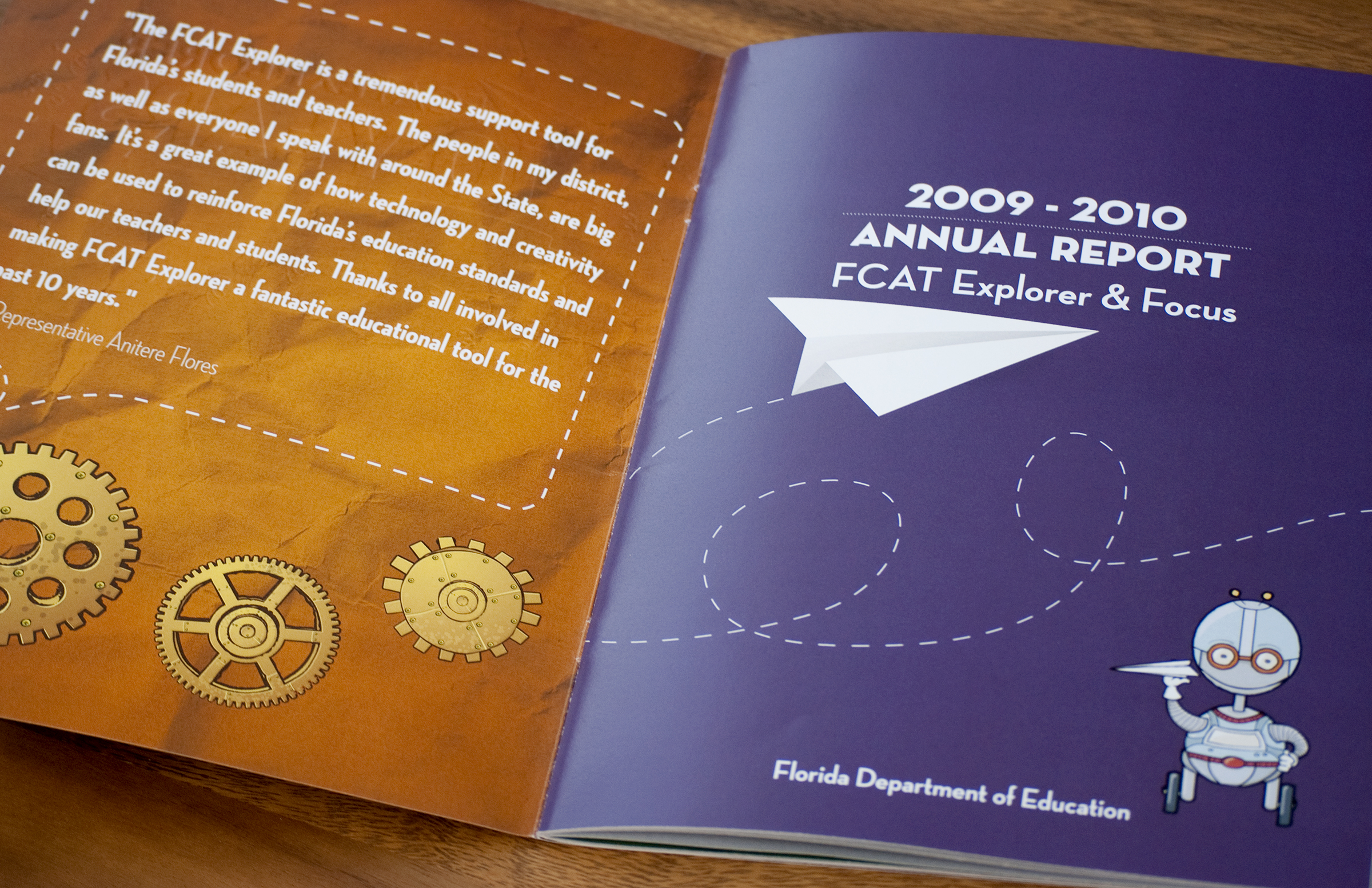 Every year the Florida Department of Education publishes an annual report on the progress of the FCAT Explorer. 2010 was the 10 year anniversary of the program, so they wanted to do something special. I designed a 10 year logo that was embossed on the cover, implemented a timeline that spanned the bottom of the pages throughout the report, brought in all of the characters from the different games and on the last page had a paper airplane tear-out with instructions. The paper airplane was apart of their logo and it was the perfect take-away for this anniversary report.